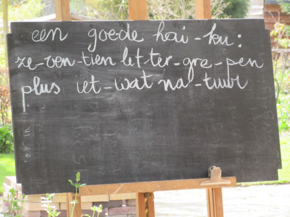 Het slot van de middag werd gevormd door het voorlezen van de diverse producten. Sommige deelnemers hadden met moeite één haiku geproduceerd, andere waren niet meer te stuiten in hun productie maar iedereen kon met een trots gevoel ten minste één eigen haiku mee naar huis nemen. Wie wilde, kon zijn poëem ophangen aan een slinger bij het raam van de kas.