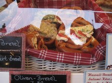 De eetcultuur op de Duitse kerstmarkten vormt een hoofdstuk apart. Je kon het zo gek niet bedenken of het was er. Nieuw voor ons was de “raclettebaguette”, een half pistoletje met vers gesmolten kaas. Ook zijn er heerlijke Brezel (noemen wij pretzels) op reuzenformaat met allerlei soorten beleg of grote korrels zout. Veel van deze typisch Duitse versnaperingen halen de Nederlandse markt niet, maar wie een snacktentje op de markt wil opzetten, krijgt hier inspiratie genoeg. De spiraalvormige gefrituurde aardappel ontbrak dit jaar jammer genoeg, maar er was Bratwurst te over in allerlei variaties. Veel snacks en snoep ook voor thuis.