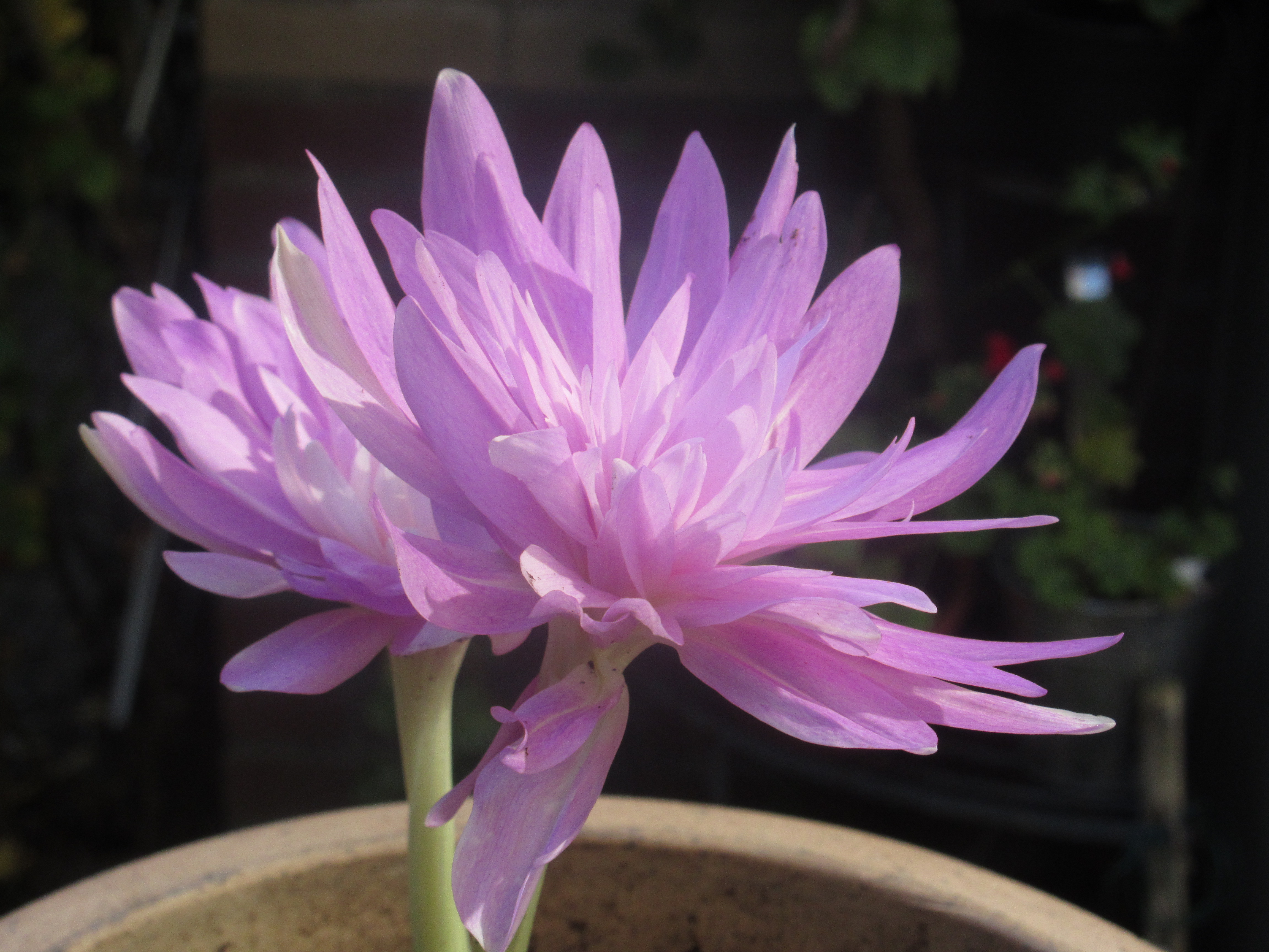 Vorig jaar waren we er niet zo kapot van … de herfsttijloos. In de vensterbank deed ‘ie het niet maar in de volle grond heeft hij het beter naar zijn zin. In de voortuin heeft hij het laten afweten, maar achter staat hij fier te bloeien. Spectaculair!