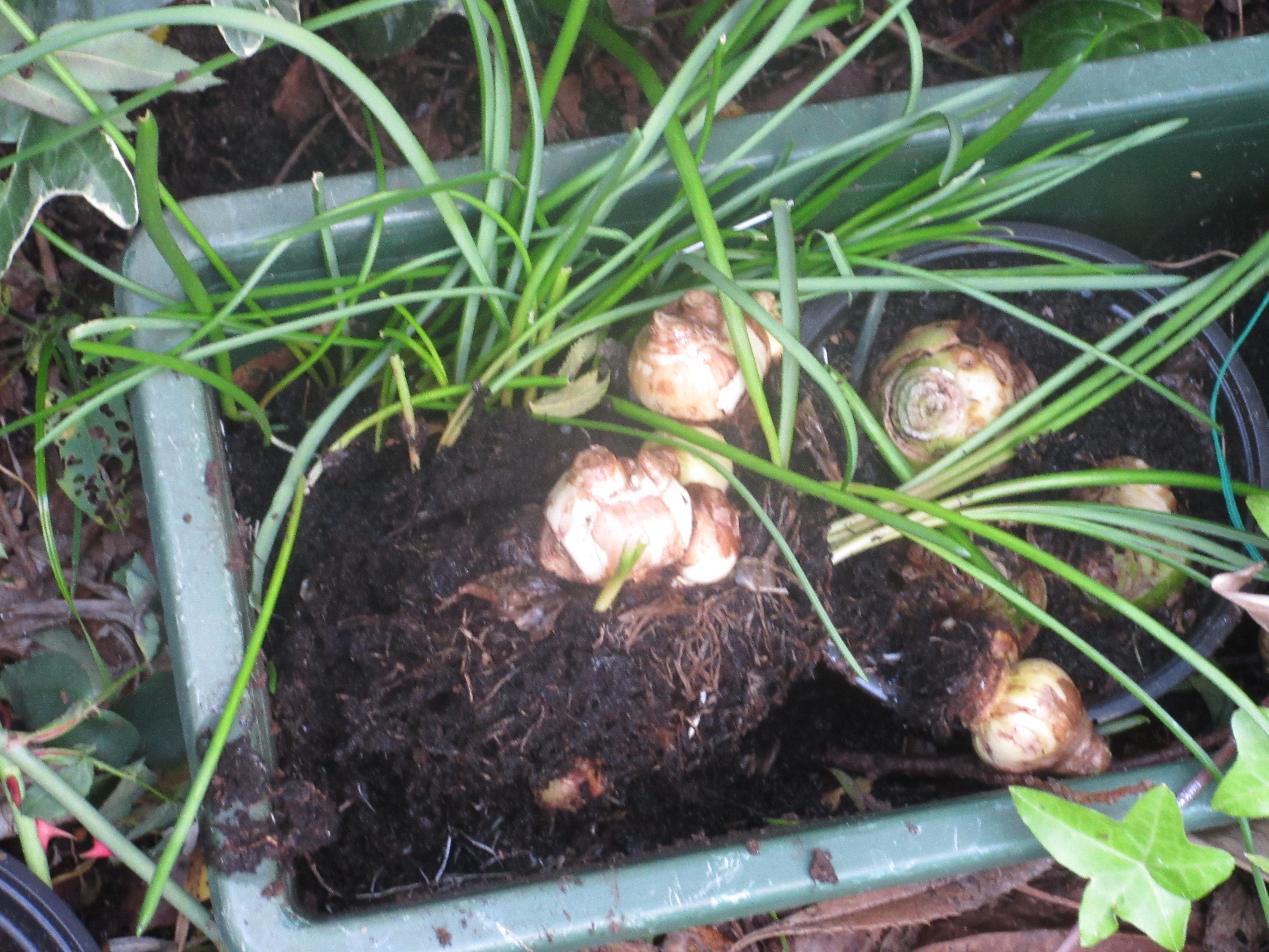 In een donker hoekje vond ik vorige week deze dappere groeiertjes. Ze gaan binnenkort echt de grond in, samen met wat crocussen.