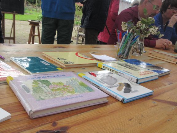 Tuinmens Elbrich Fennema en hofdichter Jim van der Eng hadden in samenwerking met bibliotheek Zuid-Kennemerland waarschijnlijk alle bestaande boeken over haiku verzameld, want de werktafel was bezaaid met tientallen boeken vol voorbeelden en theorieën.