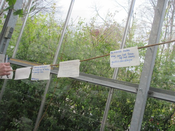 Het slot van de middag werd gevormd door het voorlezen van de diverse producten. Sommige deelnemers hadden met moeite één haiku geproduceerd, andere waren niet meer te stuiten in hun productie maar iedereen kon met een trots gevoel ten minste één eigen haiku mee naar huis nemen. Wie wilde, kon zijn poëem ophangen aan een slinger bij het raam van de kas.